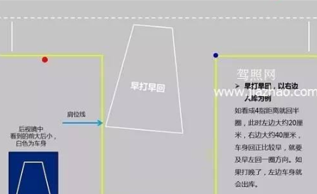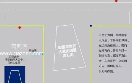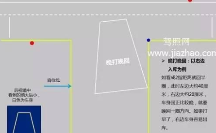 倒车入库修正口诀:早大早回,晚打晚回,哪里夹角大向哪里修方向。