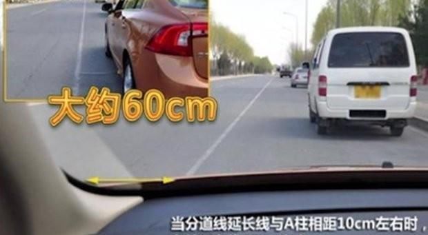 当分道线延长线与挡风左下角距离10cm左右,这时车辆距离左侧车道基本在50-60cm左右,同样如果左侧是交通隔离护栏或者是路牙,也可以通过这样来判断。