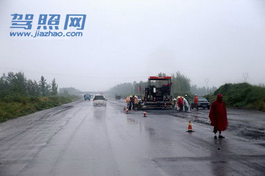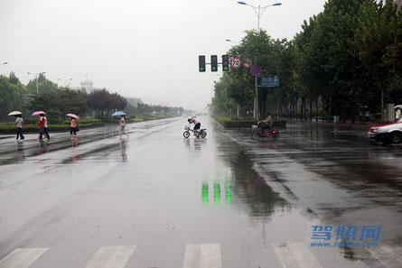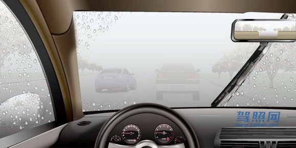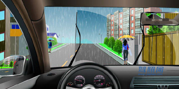 44、 如图所示,驾驶机动车在雨天行驶,驾驶人应当注意的是什么?