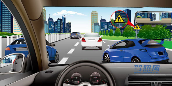 58、 如图所示,驾驶机动车路遇这种情况时,应注意施工地点情况,预防前方机动车由于异常情况紧急减速停车,应提前减速慢行,小心谨慎通过。