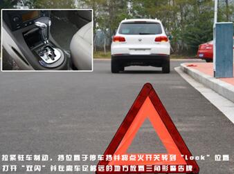 驾车外出时,难免会遇到突发情况。爆胎也是常见情况之一,下面我就来教大家如何更换汽车轮胎。在突发情况千做好准备。 一、换胎前准备 在换胎之前,在更换轮胎前,首先要将车停放在相对安全、平坦的地方。然后拉紧驻车制动,挡位置于停车挡并将点火开关转到“lock”位置。打开“双闪”并在离车足够远的地方放置三角形警告牌。 注:三角警示牌如何放置,白天在一般城市环路时要把警示牌立在车后50米的地方,如果
