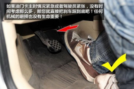在驾驶过程中经常会出现一些意外事故的发生,特别是对于脚已经离开了油门踏板,但是脚踏板还是依旧处于加油的状态。很多司机对于这种情况都会产生慌乱的情绪,这样就很容易出现交通事故。 一、油门突然被卡,太紧张没时间考虑怎么办? 直接将刹车踏板踩到底!不管是手动挡还是自动挡车型!因为无论多大的油门总会被刹车所制服的,这样做可能会对您的爱车产生一定的磨损,但对于您的生命安全来说,这不算什么。 二、自
