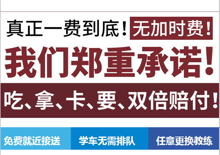 以诚信和最好的服务,对待每一位选择我们的学员!驾校担保:1.没有潜规则,无需给教练送红包、请吃饭2.正常通过考试,包拿到驾照,否则全额退款3.每个区均有办事处和场地,每位学员就近安排上海学车60天拿证不排队免体检不收礼一、周期短、领证快全上海就近培训二、上车时间灵活,特设白班、夜班、假日班,加急班服务承诺:一、教学态度端正,拒绝吃拿卡要,请客送礼现象二、培训质量到位,确保让您成为一名合格的机动车驾驶员学费可分期报名首付3000(签订学车合同),尾款考理论时付清。江苏班普通班:3个月拿证,学费5600.特快班:50-60天出证,费6600.VIP班:50天一对一服务学费来电咨询上海本地班1、学费6500不要排队,4个半月拿证不限学时、自由约车、一对四教学2、vip班:学费8500,首付3000,不限学时、自由约车、一对一教学,4个月左右拿证。学车流程:1、学车专项体检(我驾校接送)2、报名付费,签订合同,领取课本3、交通法规学习(称为科目一考试)4、五项必考(称为科目二考试)5、小路考合格一周后参加科目三场外考科目四理论考(当天可以拿驾照)有意向报名的朋友们可以在我的网页进行免费登记我会第一时间电话回复你也可以在驾校一点通进行报名、预约或者咨询。团报享有优惠,预报从速!